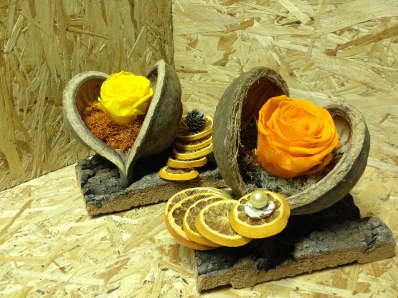 Composizione realizzata su base di corteccia e guscio di frutto tropicale con all’interno una rosa Stabilizzata, tutto decorato con fettine di arancia disidratata.