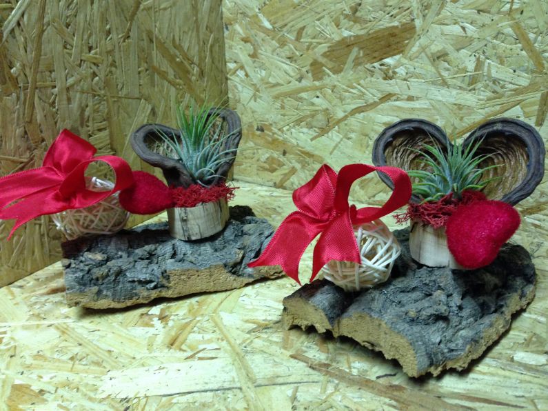 Composizione con corteccia e guscio di frutto con alloggiata una piccola tillandsia, pianta senza radici che si alimenta con l’umidità dell’aria decorata con mini sfera in rattan e cuore rosso.